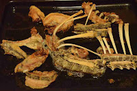 Con los huesos, los pasamos por el horno hasta que estén dorados (depende de la fuerza a la que pongáis el horno, pero no os recomiendo mucha para que no se quemen; a unos 170º C tardan en dorar unos 45 minutos, pero estad atentos a vuestro horno). El objeto de tostarlos es que luego, el caldo que hagamos con ellos, tenga color.