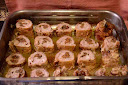 En caso de que aún vayamos a tardar un poco en servirlos, los disponemos nuevamente en la bandeja, con la salsa, cubrimos con el papel de aluminio y mantenemos en el calor del horno, ya apagado.