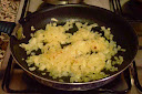 A continuación preparamos la farsa con la que rellenaremos el baifo. Para ello ponemos en una sartén un poquito de aceite y pochamos una cebolla cortada en brunoise fina.