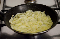 A continuación cortamos una cebolla en juliana gruesa y confitamos a fuego lento en aceite abundante hasta que esté caída.