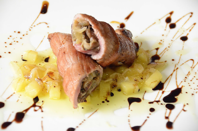 Secreto ibérico relleno de setas en cama de cebolla y manzana confitadas. |