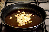 En la misma sartén y con ese aceite calentito, salteamos los ajos laminados. Que se doren ligeramente pero que no se quemen, pues si no amargarán.