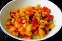 Por otra parte, lavamos los pimientos, los secamos y cortamos en brunoise gruesa. Los salteamos en una sartén a fuego medio con un poquito de aceite de oliva virgen extra. Sazonamos al gusto y removemos de vez en cuando para que no se nos quemen. Cuando estén caídos, retiramos, escurriendo el aceite y reservamos.