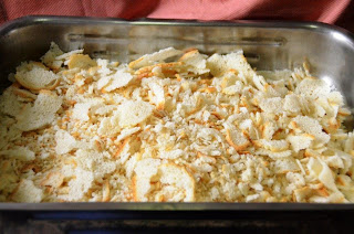 Empezamos por el pan, empleando pan de hogaza del día anterior (o de dos días, este pan se mantiene entero varios días), cortando rebanaditas finas con una navaja bien afilada. Las vamos depositando en una bandeja grande.