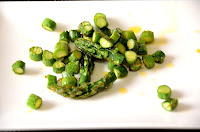 A continuación salteamos los espárragos cortados en aritos en la misma sartén, añadiendo un poquito de aceite de oliva virgen extra (si hiciera falta). Cuando estén caídos, retiramos, escurriendo el aceite y reservamos.