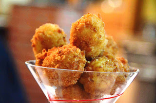 Empezamos compartiendo una tempura de verduras junto con unas croquetas de gamba. Se sirven en el mismo plato. Las croquetas dentro de una copa de coctel y, a sus pies, la tempura. Las croquetas crujientes, de masa firme pero cremosa, y en su interior una gamba. ¡Riquísimas!. Y qué decir de la tempura: crujiente, sabrosa...