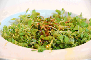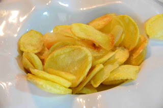 La guarnición del pescado una ensalada de corujas, aliñada con pimentón: ¡grata sorpresa!. Y para la carne unas patatas fritas. Aún estando éstas ricas, sobraron. Lo que si pedimos repetir fue la ensalada de corujas. ¡Por Dios, qué ricas!...