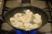 Una vez descongeladas, ponemos en una sartén ocho cucharadas soperas de aceite de oliva virgen extra y salteamos, a fuego vivo, ligeramente las gambas (como un par de minutos, no más).
