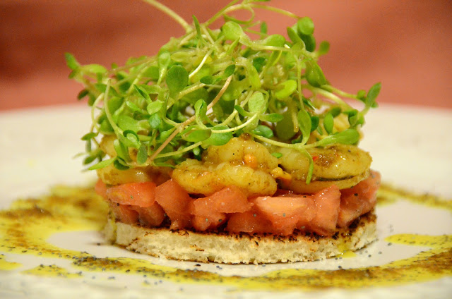 Corujas en ensalada de gambas al Ras el Hanout. |