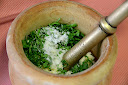 Introducimos en un mortero los ajos y el perejil picados, junto con una cucharadita de sal y majamos. Reservamos.