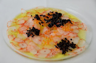 Comenzamos con un carpaccio de carabineros con cítricos, AOVE, y huevas de trucha y arenque. Propuesta ya conocida de otros restaurantes pero bien resuelta y con mucho sabor. Se sirve con unas tostas crujientes pan candeal.