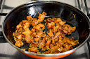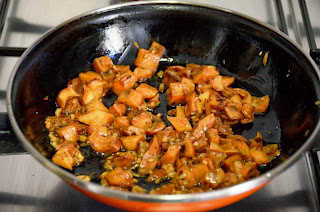 Cuando esté ligeramente dorado (en unos segundos) añadimos los níscalos troceados. Salpimentamos y salteamos a fuego vivo durante un par de minutos. Retiramos del fuego y reservamos.