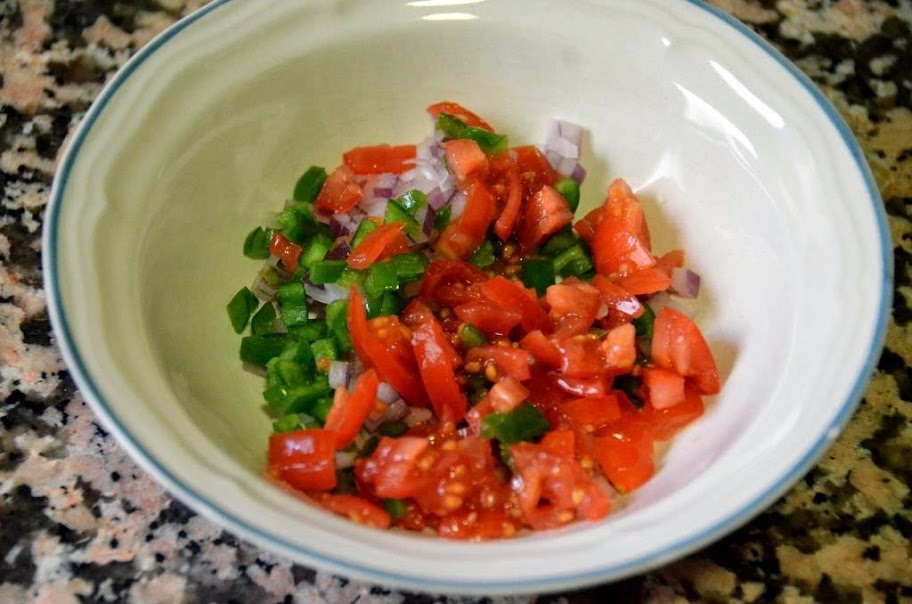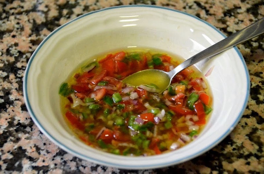 Mientras tanto, pelamos el tomate y lo cortamos en daditos pequeños, al igual que el pimiento verde italiano y la cebolla morada. Los ponemos en un cuenco y añadimos aceite, vinagre y sal al gusto. Envolvemos bien y reservamos.