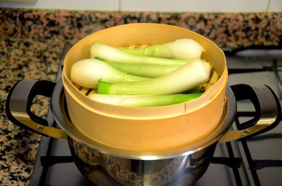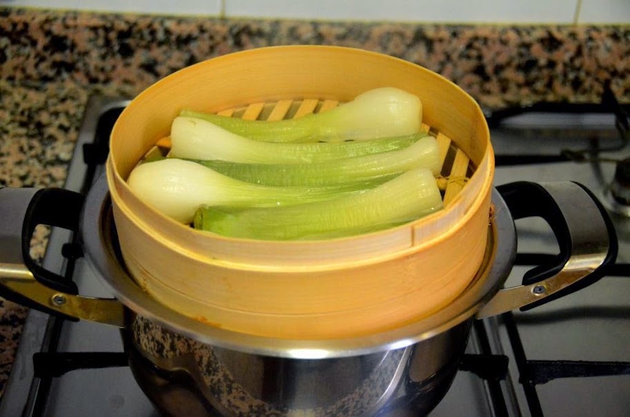 Ponemos en una cazuela agua a hervir, y cuando rompa, colocamos las cebolletas sobre la vaporera. La tapamos y dejamos hacer entre cinco y diez minutos (el tiempo dependerá del punto en el que os gusten las verduras).