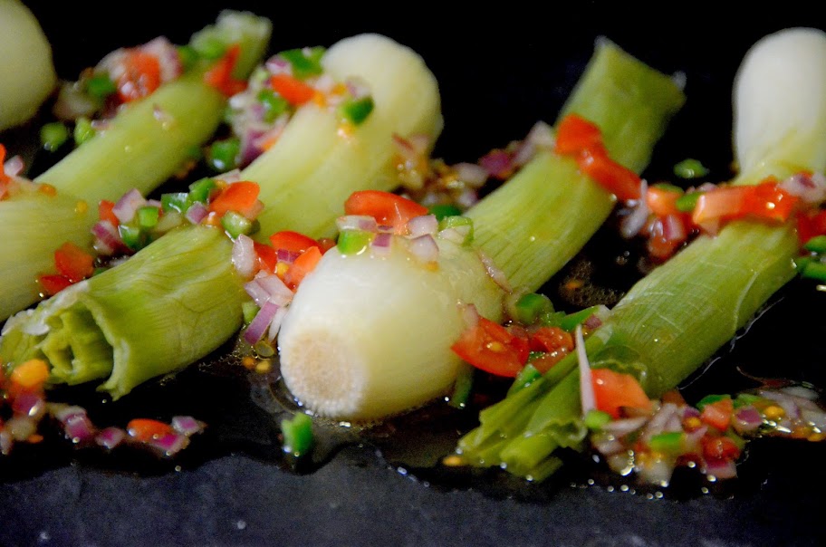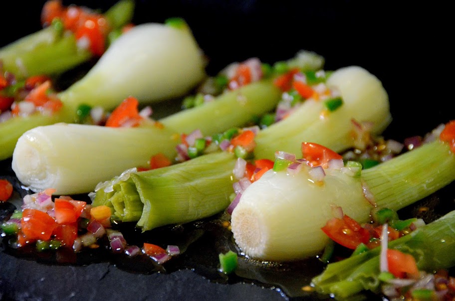 Colocamos las cebolletas sobre un plato de pizarra y salseamos con la vinagreta.
