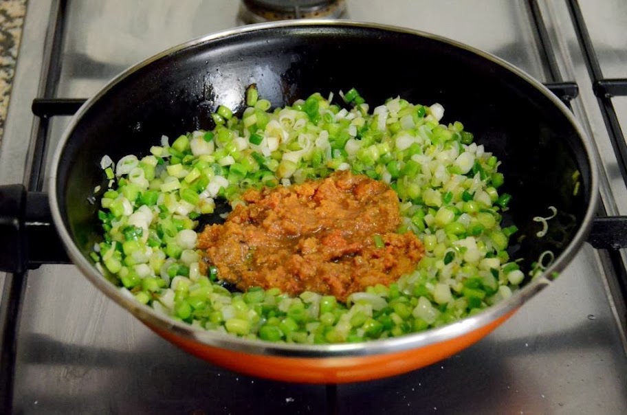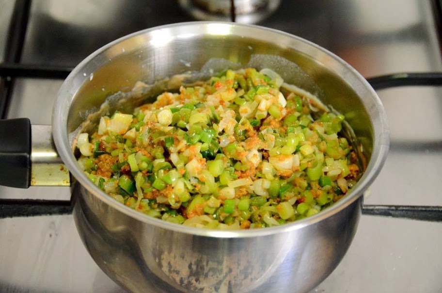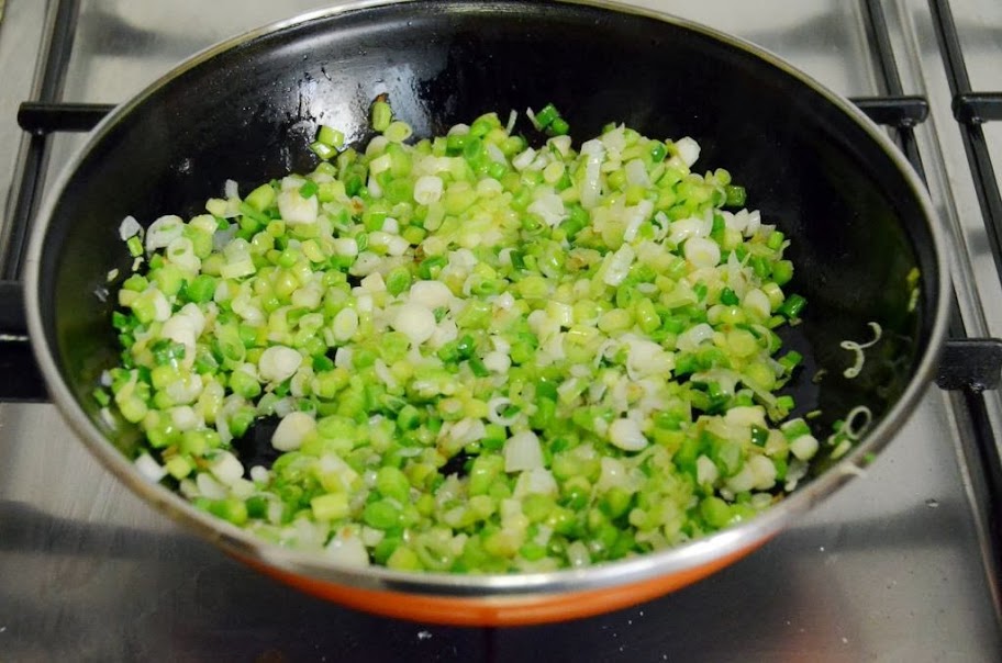 Incorporamos la cebolleta, los ajetes y los oricios salteados a la bechamel y envolvemos.