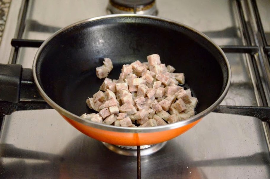 En otra sartén, sin aceite, salteamos a fuego medio la butifarra cortada en daditos, un par de minutos, teniendo cuidado porque salta mucho.