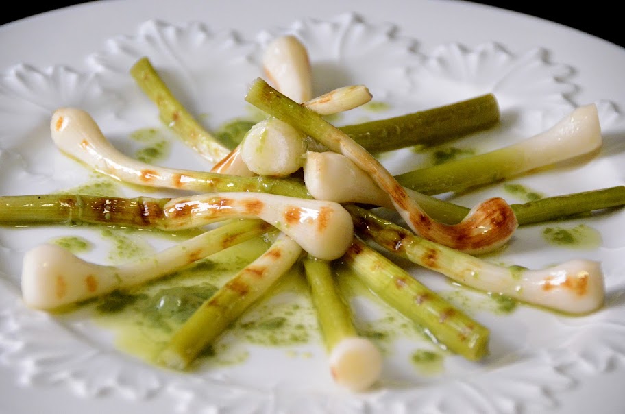 Añadimos los ajetes (salvo la parte blanca) y los trigueros. Envolvemos y dejamos hacer un par de minutos. Retiramos del fuego y reservamos hasta el momento de emplatar.