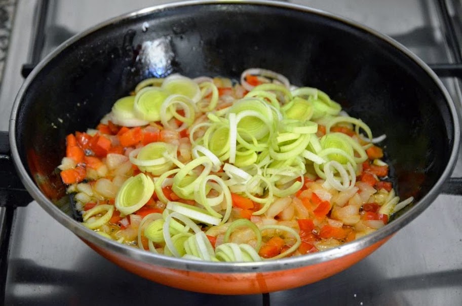 Añadimos el puerro y, de nuevo, volvemos a envolver el conjunto hasta que estén caídos los puerros.