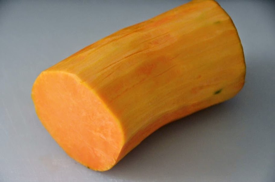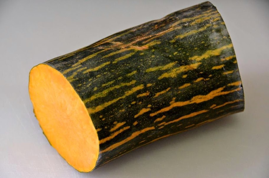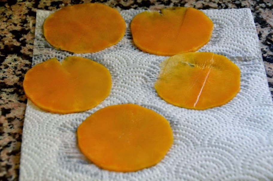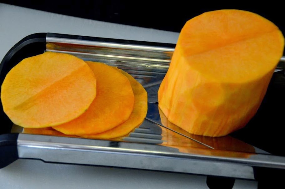 Por otra parte pelamos la calabaza y, con la ayuda de una mandolina, cortamos rodajas como de 1,5 mm de espesor (en total emplearemos 5 lonchas por comensal).