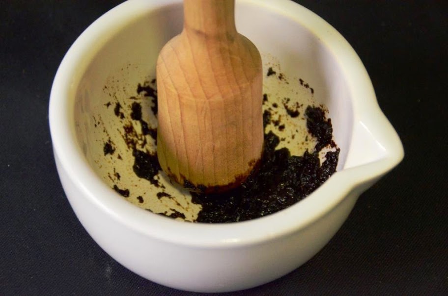 Comenzamos sacando dos dientes de ajo negro, picando finamente y majando en un mortero. Añadimos 20 cc. de aceite de oliva y dejamos macerar durante el tiempo que empleamos en preparar la receta. Así el aceite adquirirá los toques agridulces, balsámicos, de regaliz que le aporta el ajo negro.