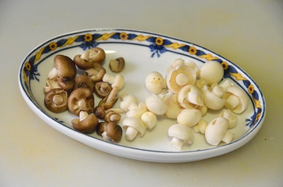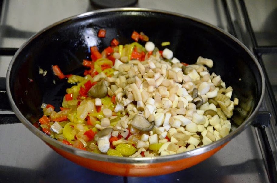 Picamos la cebolla en brunoise fina, el pimiento rojo en daditos pequeños, el puerro en aros finos, la punta verde de los ajetes también en aros finos (y reservando la parte blanca entera), los pies de las setas también en daditos como el pimiento (reservando los sombreros) y los trigueros en trocitos pequeños. Reservamos.