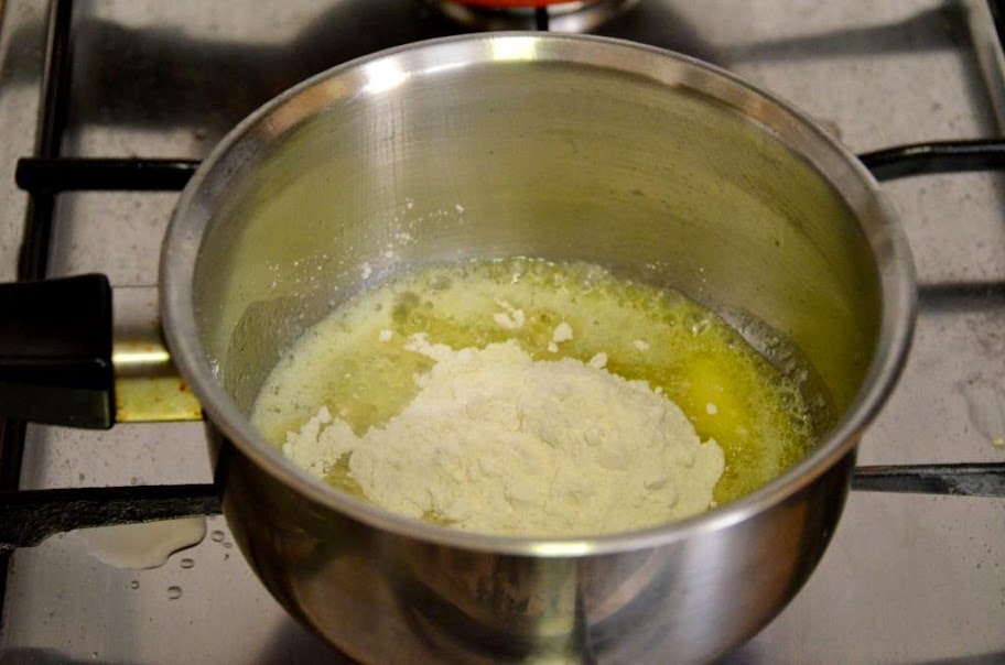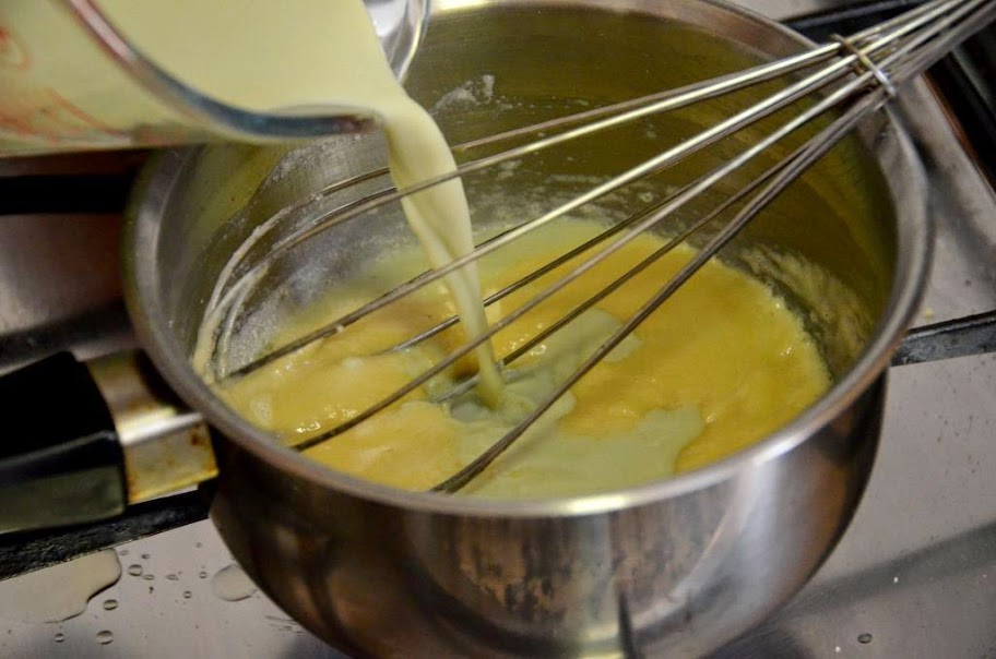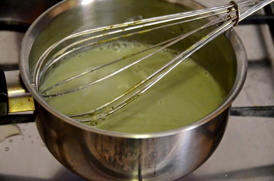 En ese momento añadimos la leche con el té verde, sazonamos, y removemos constantemente con las varillas hasta conseguir una bechamel ligera (si la queréis más ligera solo falta añadir algo más de leche, incluso al final, cuando tengamos hecha la bechamel). Ya está, justo cuando está sonando nuestro horno para sacar la calabaza...
