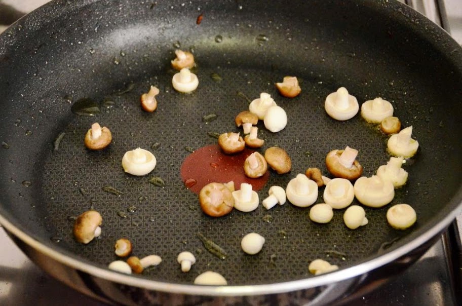 Ahora le toca el turno a las setas (excepto los sombreros). Las añadimos a la sartén junto con cuatro vueltas de pimienta negra recién molida, envolvemos y dejamos hacer un par de minutos.