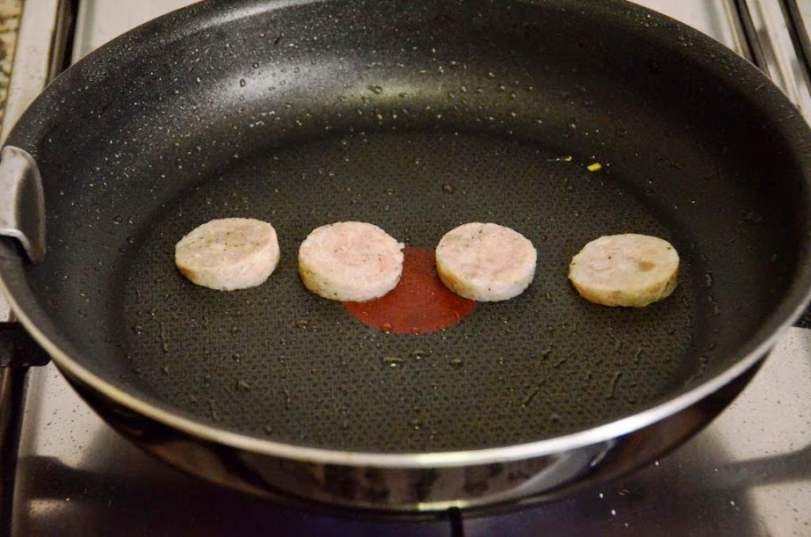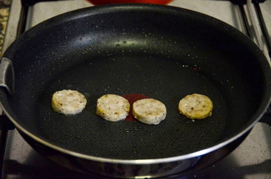 Lo mismo hacemos con cuatro rodajas de butifarra. Reservamos.