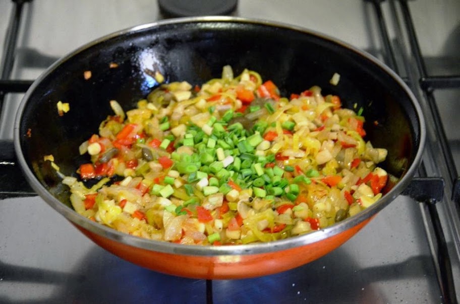 Pues bien, sacamos la calabaza del horno, retiramos la bechamel del fuego y en ese momento, salteamos los sombreros de las setas y la parte blanca de los ajetes.