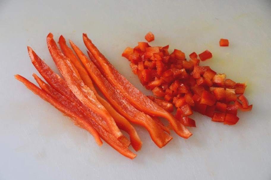 Por otra parte, ponemos en una sartén 20 cc. de aceite de oliva y, cuando esté caliente (unos 150ºC) incorporamos la cebolla y el pimiento rojo picados. Sazonamos, envolvemos todo y dejamos hacer a fuego medio hasta que estén caídos.