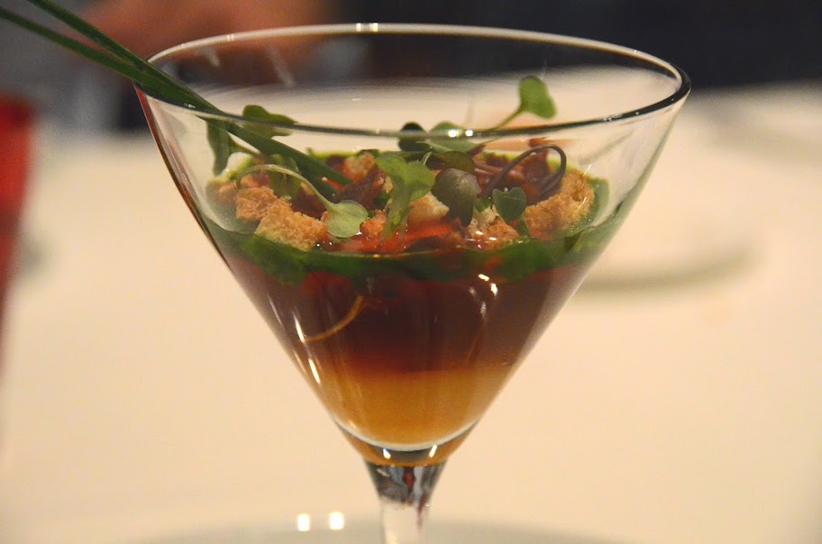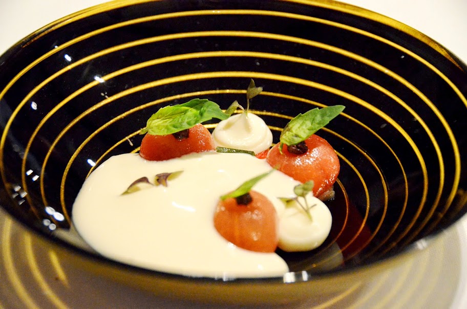 Tomate cherry con oliva, albahaca, queso y sopa de queso con cebolla. A mi me recordaba a una ensalada caprese, pero a la manchega...