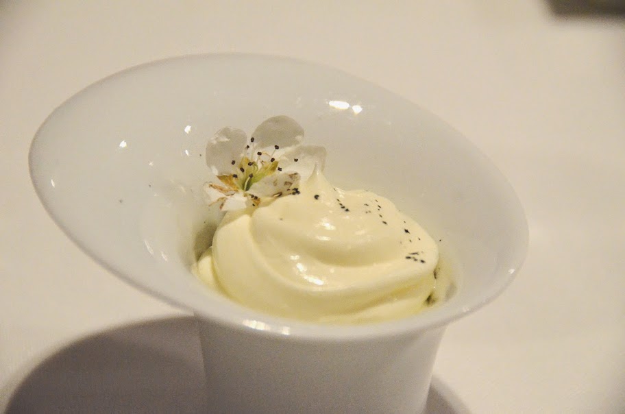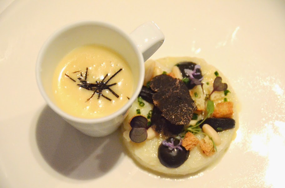 Y como pescado tradicional de "interior", no podía faltar el bacalao, presente en prácticamente todas las mesas castellanas, en esta ocasión formando un dúo: bandada de bacalao con ajo negro y trufa y una taza de ajoarriero templado con trufa.