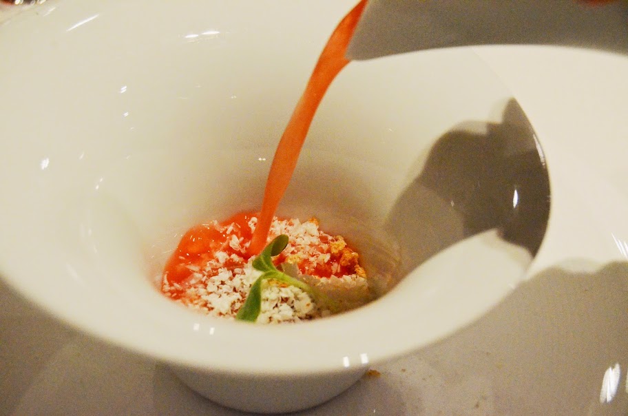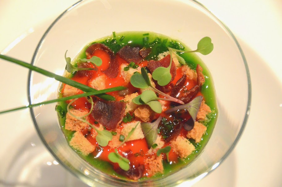De los sabores de siempre, una anchoa rellena de asadillo, queso frío y sopa de tomate. ¡Cómo me recuerda a los pinchos típicos (salvando las distancias) queso con anchoas y tomate!, ¿verdad?.