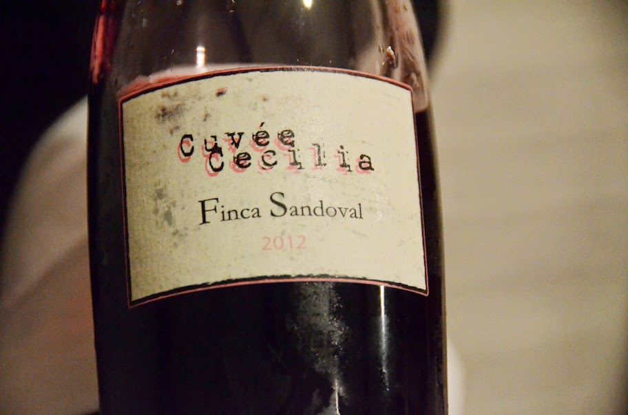 Aunque con el foie nos sirvió una copita de "Cuvée Cecilia, 2012", D.O. Manchuela. Tinto dulce con un 70% de syrah y un 30% de moscatel romano. Capa intensa de color rojo cereza con ribetes violetas. Aromas intensos de frambuesas, moras, cassis y guindas en licor. Muy untuoso y fresco en boca.