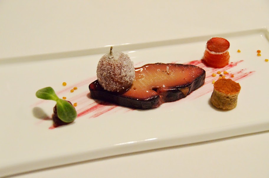 Como en cualquier restaurante que se precie, no puede faltar el foie, eso si, con una vuelta sobre la tradición, foie al vino tinto con membrillo, mazapán de pistacho y uva cristralizada con compota de manzana.