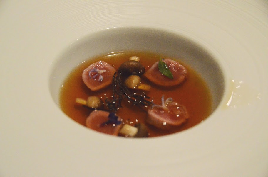 Y por fin el plato de cuchara: lomo de conejo, setas, trufas y consomé de caza.